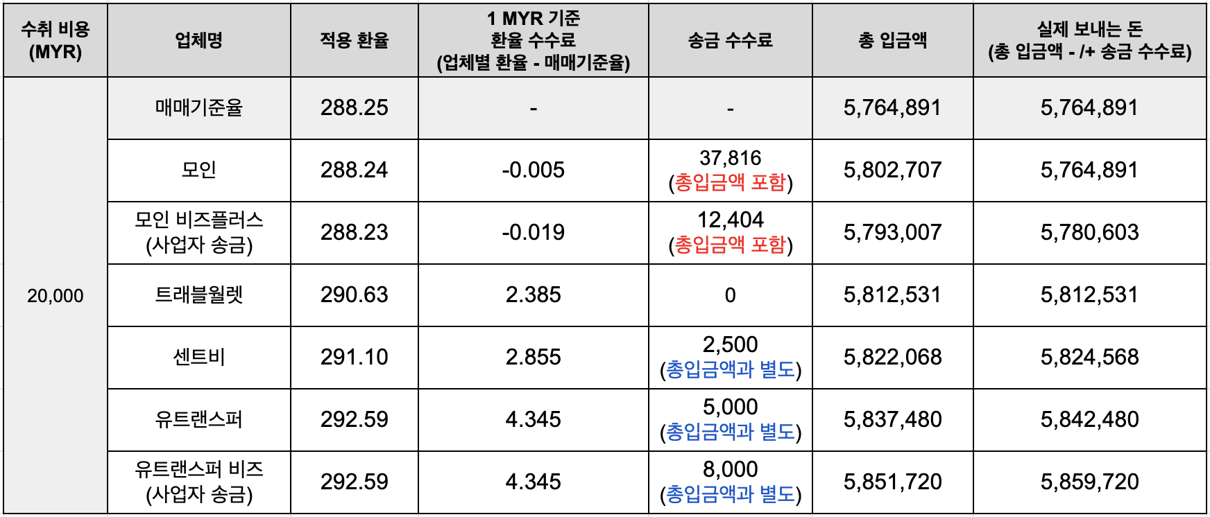 그래서 똑같은 20,000 MYR를 송금하고 싶을때, 업체별로 실제 보내는 돈은 어떻게 되는지 알아보겠습니다